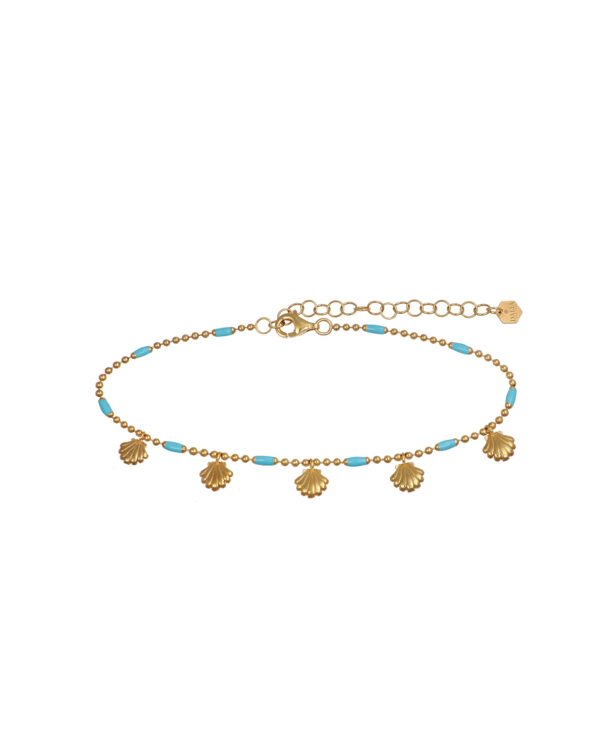 Cavigliera con Conchiglie in Argento 925 placcato Oro Giallo 18Kt e palline con Smalto Azzurro.