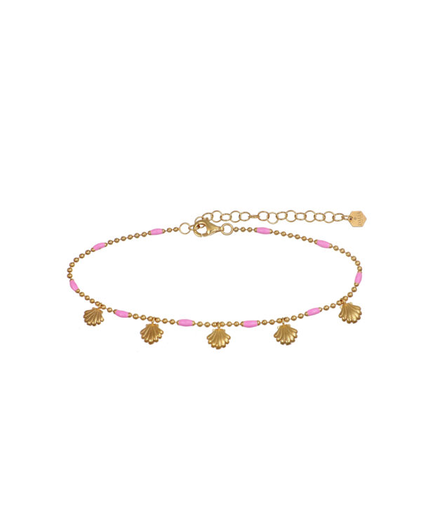 Cavigliera con Conchiglie in Argento 925 placcato Oro Giallo 18Kt e palline con Smalto Rosa.